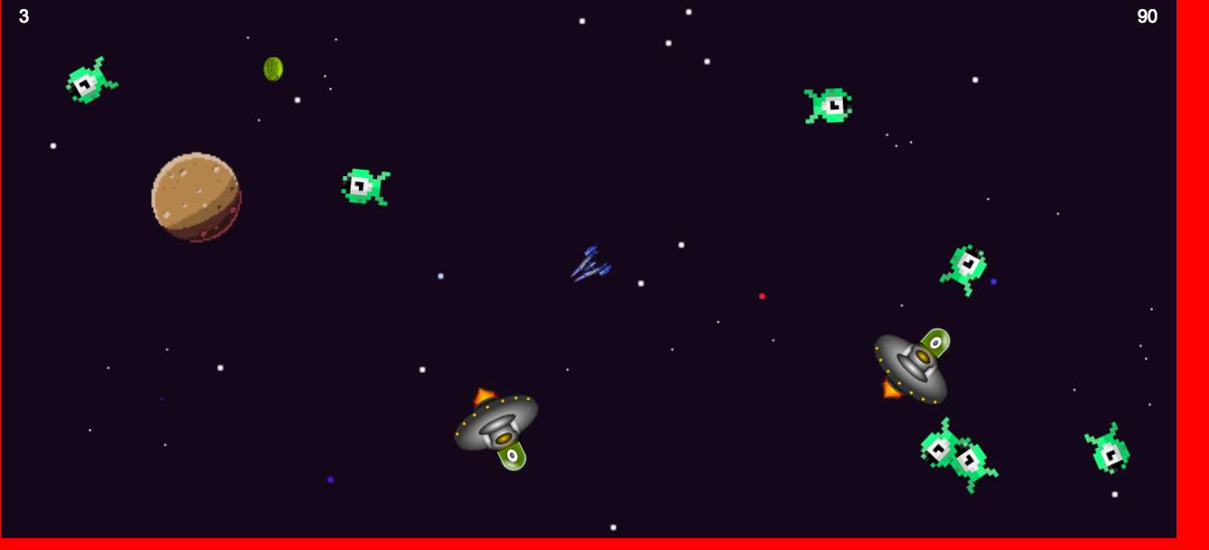 This is an alien game that I build using javascript and the phaser library. The game has the fundamentals of asteroids as far as a ship shooting big pieces to smaller pieces but I added a kick and made them alienships, aliens and alien eggs. The levels incremently add new ships for your battle to make it tougher each round.