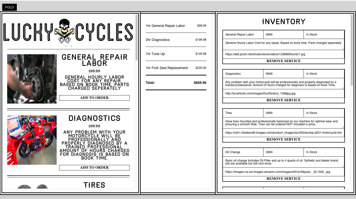 Motorcycle Repair Shop App that I built using React. List of bike shop services with user option to add more services to list. User can click what services are wanted and it will show the price of the bill.